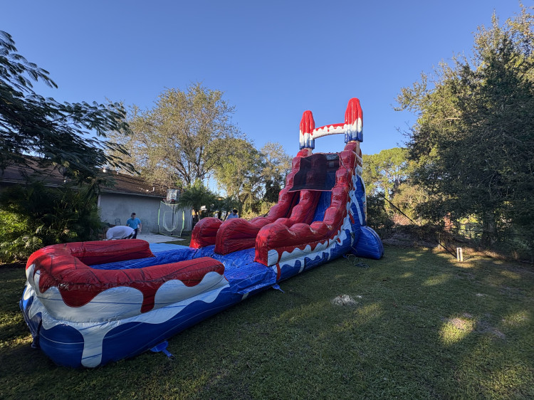 PRODUCT DESCRIPTION: The Bomb Pop Slide, also known as Red, White & Cool, is a 22ft popsicle-themed inflatable water slide in Port St. Lucie with bold red, white, and blue colors for the ultimate summer thrill.