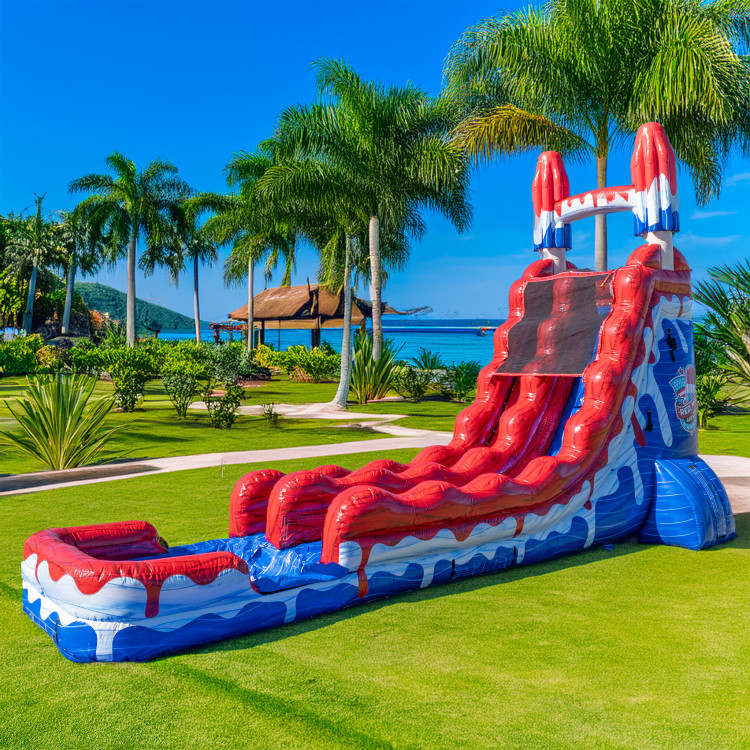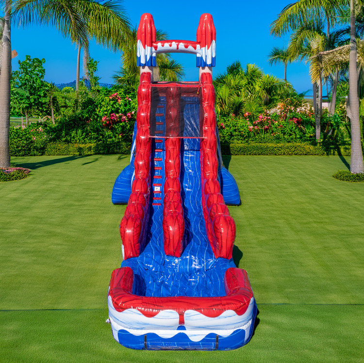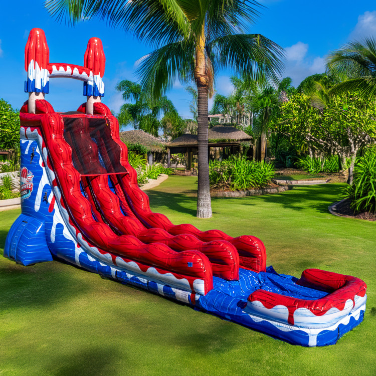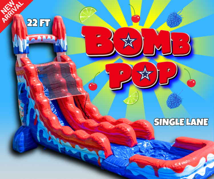 PRODUCT DESCRIPTION: The Bomb Pop Slide, also known as Red, White & Cool, is a 22ft popsicle-themed inflatable water slide in Port St. Lucie with bold red, white, and blue colors for the ultimate summer thrill.